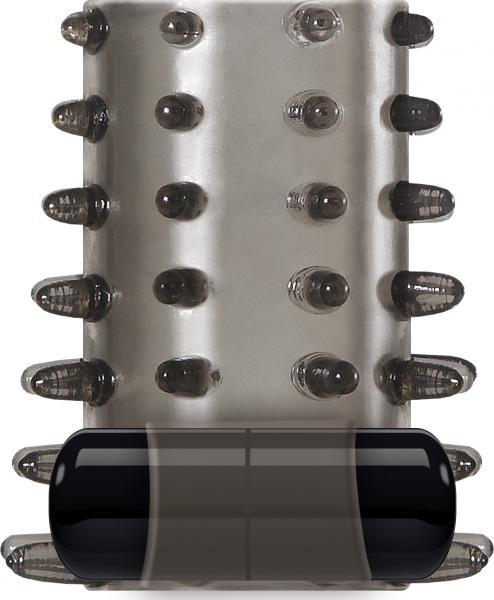 One Night Stand Penis Sleeve with Bullet Smoke from Evolved Novelties. 3 in 1 Couples Toy is Thermoplastic Elastomers TPE. Penis sleeve with nubs and protrusions for her pleasure. Package measures 2.01 inches by 4.01 inches. With bullet vibrator.