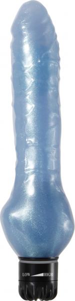 Adam and Eve Blue Dolphin Vibrator from Evolved Novelties. Add some shimmer to your shake with this powerful and eye catching multi-speed vibrator. The handy twist control base dials up the vibrating intensity from a low purr to a wild buzz. The flexible Thermoplastic Rubber TPR shaft is sized to satisfy your deepest cravings, with realistic details that make it feel fantastic with every thrust. And fun, glittery finish gives it glitz and style you will love. Clean with Adam and Eve toy cleaner and a warm water rinse.