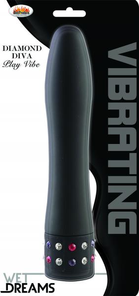 Diamond Diva Play Vibe Black from Hott Products. Traditional style vibrator with faux diamond on the bottom of the vibrator. Features: one changeable batteries included. 3 speed powerful motor. Waterproof vibrations. Phthalate free materials soft touch ABS plastic with polyurethane PU coasting.