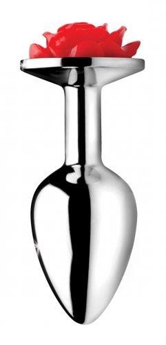 Booty Sparks Red Rose Medium Anal Plug from XR Brands. Beautify your booty with this shining red rose! Featuring a smooth metal finish in light weight aluminum, it features a lovely flower at the end which will flash as you bend over and tease your lover. The slim shaft will keep it from slipping out of place even during vigorous play.